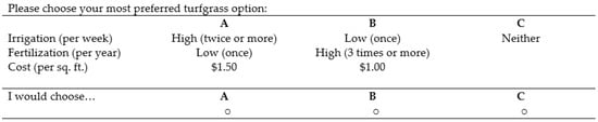 For each discrete choice scenario, participants chose between three scenarios: Option A, Option B, and Option C. Participants were asked to choose their “most preferred turfgrass option”. Options A and B had combinations of price, irrigation requirements, and fertilizer requirements. If neither of the options would be the preferred option for the participant, they could choose Option C, which is to “opt out” of choosing either Option A or Option B. The opt-out alternative increases the realism of the choice task and reduces the hypothetical bias during experimentation. Participants were instructed to assume any additional attributes (such as turfgrass color or texture) to be considered identical for both options. The attributes were defined within the bounds of the survey as follows: