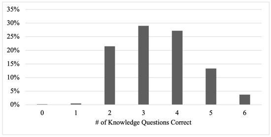 To assess the level of turfgrass basic care knowledge, participants answered six true or false questions on irrigation, plant growth, and fertilizer requirements of turfgrass. This quiz was adapted from the work of Suh et al. [88] (questions are available in Appendix A). Figure 2 displays the frequency of correct answers. Overall, participants’ knowledge was normally distributed and showed a well-rounded sample from extremely knowledgeable to not very knowledgeable homeowners. This knowledge variable was used in the estimation to predict the probability of the latent class membership.