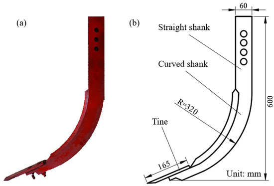 Chisel-shaped tines were often used in SS operations for long-term cultivated fields to ensure sufficient soil disturbance in deep soil. In this study, a subsoiler with a chisel-shaped tine was selected for the experiment (Figure 1), which was composed of straight shank, curved shank and tine. The subsoiler was selected based on the Chinese standards, the subsoiler and share shaft (JB/T 9788-1999). The subsoiler shank had a thickness of 25 mm. The subsoiler tine and shank were made of 65 Mn steel.