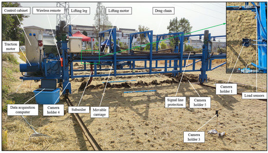 To ensure uniform speed of the drag and avoid the influence of the tractor on the soil in the process of SS, the multi-functional in situ test-rig facility was designed and manufactured for this study (Figure 2), which mainly included a movable carriage, traction motor, lifting motor, electric generator, control cabinet, control system and data-acquisition system. The test-rig was an independent structure with a span of 8 m and 1.8 m wide. A 13.5 kW electric generator was used for power and a 4 kW electric motor for traction. There was a movable carriage connected to 2 chains. The control cabinet could control the movable carriage forward and backward in terms of speed and up and down in terms of tillage depth, which was easy to operate wirelessly through a remote. The subsoiler was attached to the movable carriage. Four load sensors were equipped between the 2 chains and movable carriage. The horizontal drag force during the operation of the machine was recorded by load sensors and the change in drag force was collected by the computer.