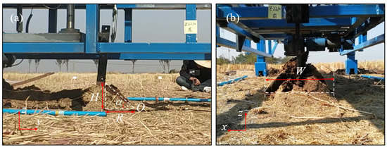 The soil-disturbance process of SS was the lifting and falling of soil blocks periodically, this paper obtained the indicators of SS with the static image of the highest point of lifting soil in the video, specifically including lifting length R, lifting width W and lifting height H in the x, y and z directions. Among them, H and R were captured from videos of Cameras 2 and 3 (Figure 4a), and W was captured from the video of Camera 4 (Figure 4b). Six static images from each video were used to obtain parameters. The image was edited using the software Digimizer (MedCalc Software Ltd., Ostend, Belgium) based on the size of the subsoiler shank.