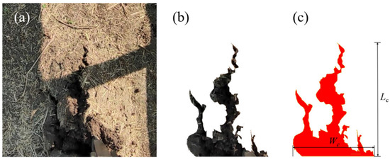 To obtain the parameters of the crack pattern, techniques of digital image processing are often used. The procedure of digital image processing is shown in Figure 5. First, static crack images were captured from Camera 1 (Figure 5a). Second, the crack was carefully picked out of the image using the image matting software Adobe Photoshop 2021 (Adobe Systems Incorporated, San Jose, CA, USA) (Figure 5b). Finally, to determine the crack area, perimeter, length and width, the crack image is loaded into the software Digimizer to generate a binary red and white image. This process was called binarization (Figure 5c).