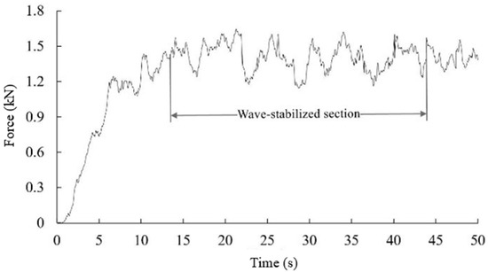 Draft forces were measured in real time for each test using calibrated S-type load sensors of 2 tons maximum load capacity. Data acquisition was conducted using LabVIEW 2010 graphical software (National Instruments Corporation, Austin, TX, USA). Acquired data were saved to a laptop in LabVIEW measurement format (LVM), at a rate of 500 Hz and later converted to MS Excel spreadsheets for processing. The draft force was obtained by subtracting the sum of the back 2 sensors from the sum of the front 2 sensors, with 2 sensors at the front and 2 sensors at the back of the movable carriage. After MS Excel processing, the filtered draft force was obtained as shown in Figure 6, and the average value of the wave stable section was selected as the draft force F at each test.