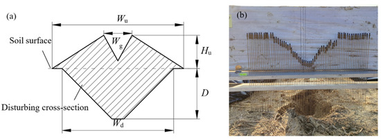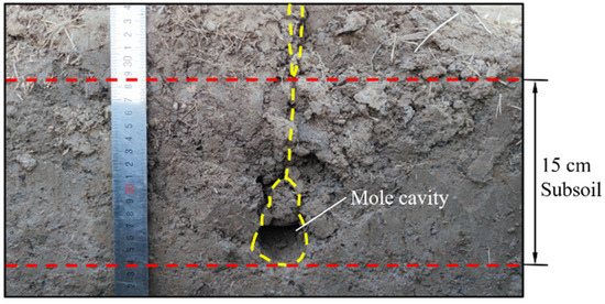 Similar soil failure patterns were also found in this paper. Figure 12 indicated that the shear resistance of soil lateral flow existed in the soil-disturbance cross-section at 20, 25, and 30 cm depths, which meant that the critical depth was about 15 cm deep. After SS, the soil above the critical depth was disturbed and lifted to both sides, forming a crack in the middle, with a “peak-like” uplifted form above the soil surface, and the disturbing boundary was a “wide upper and narrow lower” fan shape. However, the subsoil became wet, sticky and consolidated in the progress of paddy farming [36,37]. Therefore, the soil below the critical depth was laterally compressed by the subsoiler, and the “squeezed” soil fell back to the middle under its gravity after the subsoiler passed, forming the “mole cavity” at the bottom of disturbed boundary, which is shown in Figure 13. When the tillage depth was less than or close to 20 cm, the overall shape of disturbance boundary was “fan-shaped”, and when the tillage depth was greater than 20 cm, the bottom of disturbed boundary formed a “mole cavity”, which was consistent with the result of Godwin [38] at the tillage depth of 50 cm. In addition, the soil-disturbance cross-sections in Figure 12 for tillage depths greater than 20 cm differed from the indoor soil bin experiments of Hang [33] and the dryland farming experiments of Hang [39] and Godwin [32] due to the difference in soil properties.
