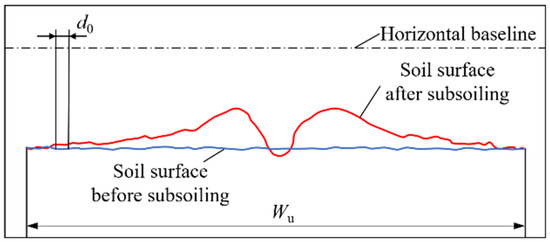 On the soil surface after SS, a horizontal line was made over the highest point as a baseline, as shown in Figure 8. In the range of upheaving width Wu with d0 (10 mm) as equal marking points, the vertical distance from each marking point to the horizontal baseline after SS was measured, respectively. The mean and standard deviation were calculated as in Equation (3). The standard deviation was expressed as surface roughness. The above test was measured 3 times to determine the mean value.