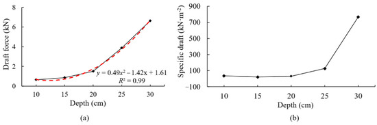 Draft force is an important parameter for the structural design of subsoiler and power matching for tractors [28]. Figure 9a showed that draft force increased with increasing depth and showed a nonlinear quadratic function relationship, which was consistent with the result of Ibrahmi [31] and Manuwa [28]. The draft force of 20 cm tillage depth increased 176.7% compared to 15 cm tillage depth, while 25 cm and 30 cm tillage depth increased 256.1% and 438.5% compared to 20 cm tillage depth. The above results may be related to the change of soil properties of paddy soil (Table 1), i.e., with increasing tillage depth, soil bulk density increased, soil porosity decreased, soil became compacted, soil disturbance increased and therefore draft force increased rapidly.