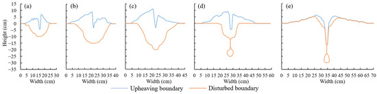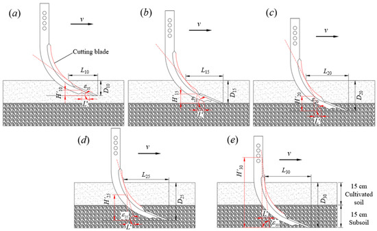 Soil-disturbance cross-sections at different tillage depths (a) tillage depth of 10 cm, (b) tillage depth of 15 cm, (c) tillage depth of 20 cm, (d) tillage depth of 25 cm, (e) tillage depth of 30 cm.