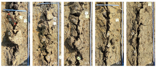 Tillage affected soil microrelief, with high surface roughness and total porosity increasing soil infiltration and thus soil water storage [41]. After SS, the cracks were asymmetrically distributed on the soil surface along the forward direction of subsoiler (Figure 15), which was consistent with the results of Godwin [38]. Figure 15 showed that the soil surface was disturbed differently by subsoiler. Soil surface disturbance was greater at tillage depths of 10 cm, 15 and 20 cm, and less at tillage depths of 25 and 30 cm. To indicate the size of the raised clods on the soil surface by the subsoiler, three larger clods were selected in Figure 15 to measure the size, and combined with the results of the surface roughness after SS as shown in Table 6, the surface roughness and the size of the average clods reached the maximum at tillage depth of 20 cm. Therefore, the results showed that tillage depth of 20 cm was suitable for SS with maximum energy efficiency and maximum soil disturbance, and tillage depth of 30 cm was suitable for minimal damage to the surface roughness after SS and agronomic requirements such as wheat root penetration, which was different from the suitable tillage depth of 25 cm in the North China Plain [42].