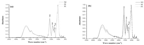 The mucilage spectra of plants that were not irrigated had more intense bands, indicating higher contents of carboxylic acids, proteins, and uronic acids. This is consistent with our findings of increased proteins, some monosaccharides, and uronic acids in the mucilage from NI plants. This suggests that these compounds are synthesized by cactus pear plants as a possible defense mechanism against drought, either for water retention or energy storage. In response to a severe drought, maize plants showed changes in the infrared bands corresponding to proteins and carbohydrates [49].