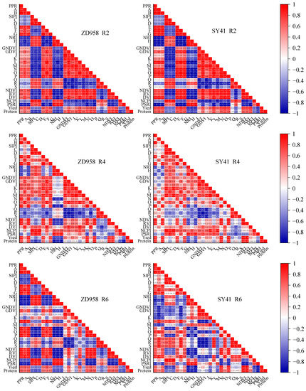 Maize yield and total protein content are closely related to its growth. In the past, destructive sampling was used with high investment and low efficiency. Previous studies have shown that due to the growth and development of crops, the spectral characteristics of images of the field will change, which indirectly reflects the growth and development process of crops [33]. Crop-growth monitoring has had good progress, but most methods focus on the quantitative relationship between remote-sensing parameters and agronomic indicators in a single period [34,35]. In this study, we analyzed the changes in the NDVI, RVI and PSRI of summer maize in the R2, R4 and R6 periods under different treatment conditions. The NDVI [36], RVI [37] and PSRI [38], which have been verified by predecessors and can be used to monitor plant growth, were selected for the detection of plant growth. Under different densities, NDVI and RVI decreased with the decrease in the nitrogen application rate, while PSRI increased with the decrease in the nitrogen application rate. Therefore, we can infer that the vegetation index represented by NDVI, RVI and PSRI will change regularly with the change in treatment conditions under different treatments.