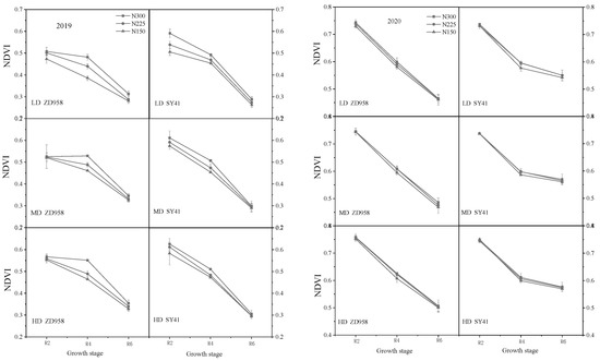 Effects of decreasing N rates under different planting densities on NDVI in 2019 and 2020. Note: LD: 60,000 plants·ha−1; MD: 75,000 plants·ha−1; HD: 90,000 plants·ha−1; N300:300 kg·ha−1; N225:225 kg·ha−1; N150:150 kg·ha−1, the same as below.