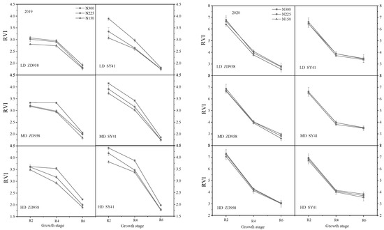 Effects of decreasing N rates under different planting densities on RVI in 2019 and 2020.