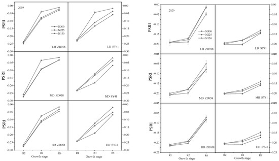 Effects of decreasing N rates under different planting densities on PSRI in 2019 and 2020.