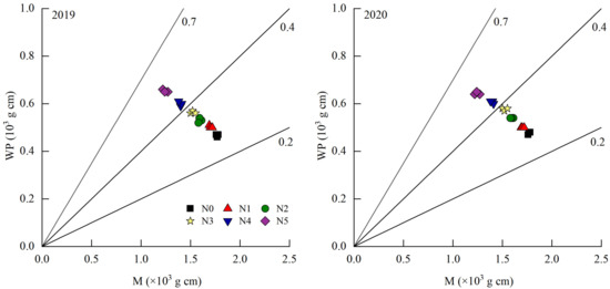 Relationship between M, WP and LI by whole plant of rice under dry cultivation under different N application rates in 2019 and 2020. Dotted lines indicate the LI. N0, N1, N2, N3, N4 and N5 refer to the N application rate being 0, 70, 140, 210, 280 and 350 kg ha−1, respectively. M: Breaking strength. WP: Bending moment of the whole plant. LI: lodging index.
