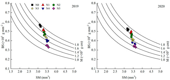 Relationship between SM, BS and M of rice under dry cultivation under different N application rate in 2019 and 2020. N0, N1, N2, N3, N4 and N5 refer to the N application rate being 0, 70, 140, 210, 280 and 350 kg ha−1, respectively. M: Breaking strength. SM: Section modulus. BS: Bending stress.