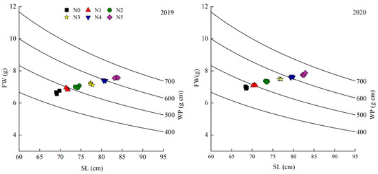 WP can be further broken down into two components, including SL and FW. Year and N application had a significant effect on SL and WP (Table 1). SL and WP increased significantly with increasing N application (Figure 3), and both reached significant levels (Table 1) with consistent trends between the results of both years of the study.