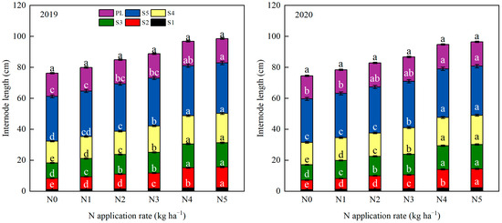 Internode length under different N application rates in 2019 and 2020. N0, N1, N2, N3, N4 and N5 refer to the N application rate being 0, 70, 140, 210, 280 and 350 kg ha−1, respectively. S1, S2, S3, S4, and S5 denote the first internode to the fifth internode base from the stem base, respectively. Panicle length (PL). The same letter means they do not have significantly different at the 0.05, the different letter means they have significantly different at the 0.05.