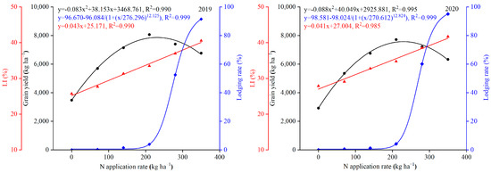 The relationships between the grain yield, lodging rate, LI and N application were fitted with different curves and all reached a highly significant level (Figure 5). The polynomial regression equations for grain yield versus N application in 2019 and 2020 were y = −0.083x2 + 38.153x + 3468.761, (R2 = 0.990**) and y = −0.088x2 + 40.049x + 2925.881, (R2 = 0.995**) respectively, which were calculated to provide a maximum N fertilizer application of 229.84 kg ha−1 and 227.55 kg ha−1, respectively. The highest grain yields of 7853.25 kg ha−1 and 7482.49 kg ha−1 were achieved at 229.84 kg ha−1 and 227.55 kg ha−1, respectively.