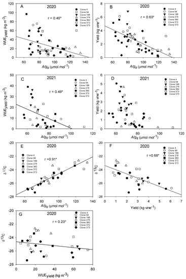 (A) Relationship between average A/gs measured from fruit set to harvest in the morning, and productive WUE in 2020. (B) Relationship between average A/gs measured from fruit set to veraison in the morning and midday, and yield at harvest in 2020. (C) Relationship between average A/gs measured in the morning at pre-veraison period, and productive WUE (WUEyield) in 2021. (D) Relationship between average A/gs measured in the morning at pre-veraison period, and yield in 2021. (E) Relationship between average A/gs measured during the whole season (pre- and post-veraison period, early morning and midday) and carbon isotopic δ13C in berries in 2020. (F) Relationship between yield at harvest and carbon isotopic δ13C in berries in 2020. (G) Relationship between WUEyield and carbon isotopic δ13C in berries in 2020. Each point represents the measurement in a single vine for the different clones and under control and stress conditions. *, indicate significant differences at the 0.1 levels of probability.