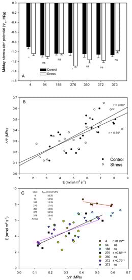 (A) Differences in midday stem water potential (Ψs) between control and stress treatments for each clone during post-veraison periods (average data from two years: 2020 and 2021). (B) Significant linear relationship between leaf transpiration rate (E) and ΔΨ (Ψl-Ψs) measured at midday during post-veraison in 2020. * p < 0.05. In (B), points represent data from all of the clones. (C) Significant relationships between gradient of water potential in the leaves and leaf transpiration measured at midday for each clone, during post-veraison period in 2020 (20th August 2020). In (C), each single point is a single measurement made in the same leaf in a vine. Kleaf was calculated in August 2020 for each clone using the evaporative flux method (see Material and methods). ns, not significant, * p < 0.1, ** p < 0.05, *** p < 0.01.
