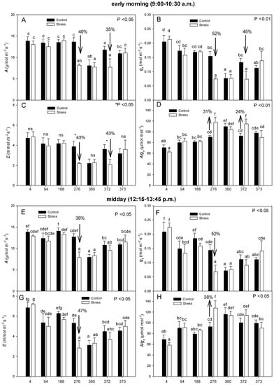 Essentially, the stress treatment significantly decreased leaf gas exchange (A, gs, Ci) and increased A/gs in all of the clones during the pre-veraison period in 2020 (Table 3). However, during post-veraison, significant interactive effects in gas exchange parameters (A, gs, Ci, E, A/gs) indicated different leaf gas exchange regulation under water stress, depending on the clone (Table 3). Therefore, during post-veraison, vines from 276 and 373, under water stress, showed a significant decrease in A, gs, and E and an increased A/gs at the early morning compared to their control vines (Figure 4A–D). In the same way, at midday, clone 276 under WS had a strong decrease in A, gs, and E (38–52%) and an enhanced A/gs (38%) compared to its control. Other clones, such as 373 and 188, also restricted their leaf gas exchange at midday, but to a lesser extent; between 16% and 9.5% on average, respectively (significantly lower gs in 188 under WS compared to their Control) (Figure 4E–H). In other clones, there were no significant differences in leaf gas exchange between control and stress vines at the early morning or midday.