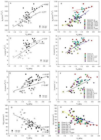 Significant relationships between midday stem water potential (Ψs) and leaf gas exchange parameters measured at midday (12:15–13:45 p.m.) for high (4, 94, and 188) and low/moderate-vigour clones (276, 360, 372, and 373) (A,C,E,G) and for each clone (B,D,F,H) during the post-veraison period (August) in 2020. Each point represents a single measurement of Ψs and leaf gas exchange made in the same vine. ns, not significant; * p < 0.05.