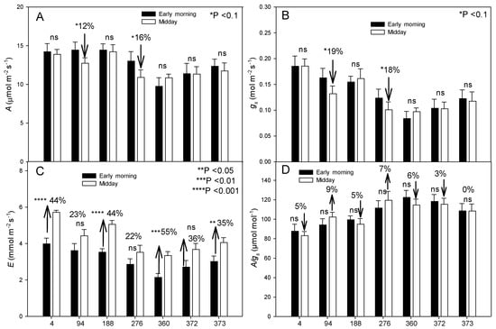 Differences between mean values of leaf gas exchange rates measured at early morning and midday for each clone during the post-veraison in 2020. Vertical bars represent the standard errors. ns, not significant; * p < 0.1, ** p < 0.05, *** p < 0.01, **** p < 0.001. Separation was made by Duncan’s multiple range test at the 95% confidence level.