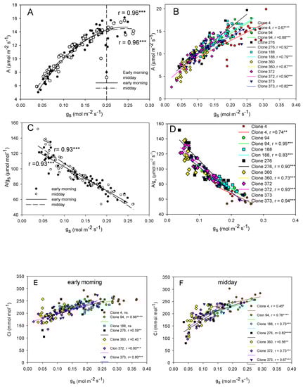 There were significant relationships between gs and A (positive, Figure 8A) and gs and A/gs (negative, Figure 8C) at the early morning and at midday. Moreover, a detailed analysis of these relationships indicated that for the same value of gs (between 0.10 and 0.30 mol m−2 s−1), clone 4 had a lower A than clones 276, 188, or 372, over all at higher gs (>0.15 mol m−2 s−1) (Figure 8B). In addition, for the same gs value, clone 4 also showed a lower A/gs compared to other clones; this effect was more accentuated with a low gs (Figure 8D). In addition, there were significant relationships between stomatal conductance (gs) and intercellular CO2 concentration (Ci) for each clone, except for clone 4, which showed an unchanged Ci for a wide range of gs (from 0.35 to 0.15 mol m−2 s−1) at the early morning, compared to the rest of the clones, where Ci decreased linearly as stomatal closure occurred (Figure 8E). This effect was more accentuated at midday, with clone 4 showing a lower slope (significant relationship), while in clones 276 and 372, Ci decreased most quickly as stomatal closure occurred (higher slope) (Figure 8F).