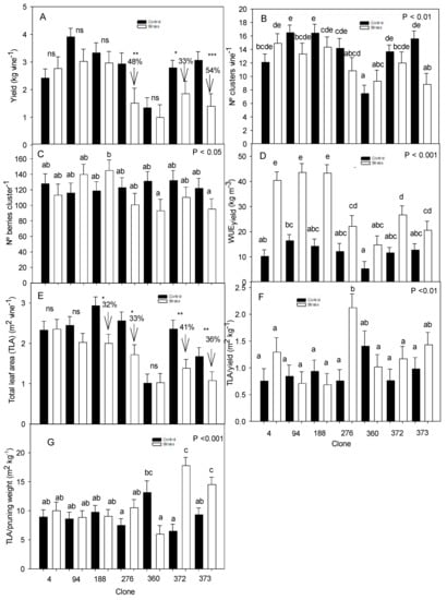 Significant interactive effects of clone and irrigation treatment in yield (yield, no. clusters per vine, no. berries per cluster and WUEyield), vigour parameters (total leaf area), and sink-source ratios (TLA/yield, TLA/pruning weight). Values are the average of three years: 2018–2020. Arrows indicate the percentage of reduction with regards to their controls. Different letters indicate significant differences according to Duncan’s multiple range test at the 95% confidence level. In A and E, we also did a unifactorial analysis (ANOVA) for each clone, looking for significant differences between control and stress treatment. ns, not significant. * p < 0.05; ** p < 0.01; ***, p < 0.001, according to Duncan’s multiple range test at the 95% confidence level.