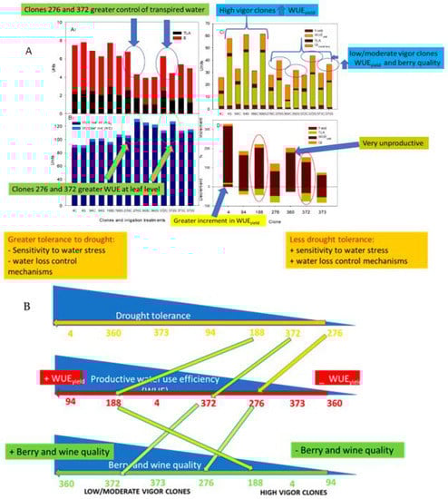 On the other hand, predicted impacts of climate change on crops could also be mitigated by exploiting the existing genetic diversity within crops. For instance, wine grapes possess a tremendous genetic diversity (both intercultivar and intracultivar) in traits that affect the response to climate conditions, such as phenology and drought tolerance, to cope with a high diversity of climate regimes, but this diversity is still scarcely exploited []. Instead, in many countries, the same 12 varieties (international varieties), which represent a mere 1% of total diversity among the 1100 commercial varieties of grapevines that are planted worldwide, take up to 70–90% of total hectares []. Of special relevance are the local/traditional varieties/clones, which often outperform modern, widely-planted cultivars and which have led to a growing interest in better understanding, preserving, and exploiting this diversity. Indeed, the diversification of rootstocks and clones as a way of increasing genetic variability, avoiding the cultivation of a single rootstock and clone combination, has been proposed in winegrapes [], in an effort to explore clone × rootstock interactions when comparing tolerance to abiotic stresses in different cultivars []. Exploring grapevine intracultivar variability (e.g., clones) is particularly interesting because there is consistent evidence of significant interclonal variability in water use efficiency at a leaf level (WUEleaf (A/gs)), carbon isotopic discrimination (δ13C), stomatal regulation, photosynthetic capacity, and biomass/yield traits [,,,,], and, indeed, it respects the cultural and social components of winegrape cultivation and the wine typicity associated with local terroir. Therefore, identifying new clones with a superior drought tolerance would provide genetic material that has a greater water use efficiency, thereby reducing reliance on supplemental irrigation [].