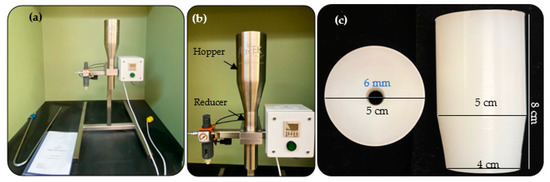 To test the flowability of SAP-coated seeds, a laboratory-scale seed flow meter (Centor Oceania’s Lab FlowTek, Carrum Downs, Victoria, Australia / Aginnovation LLC, Walnut Grove, CA, USA) was used (Figure 1a,b). Seed flow meters measure how quickly seeds will pass through planting equipment, and predict problems with lodging in hoppers or reductions in seed flow related to the coating materials compared to the non-treated seeds. It also helps with gauging plantability in the field. For this study, we modified the seed flow meter for use with small seeds. A reducer with 6 mm diameter opening was machined from high-density polyethylene (HDPE) and inserted into the hopper (Figure 1c).