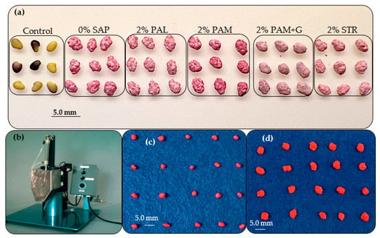 Seeds were coated (2% of the seed weight) with four commercially available SAP formulations (Figure 4a) using a laboratory-scale rotary pan coater (Figure 4b). The uniformity of the SAP application was observed by the swelling of individual SAP-treated seeds (compare Figure 4c with Figure 4d). To further display the rapid water uptake of the SAP-coated seed, a time-lapse video (Video S1) shows the 20% PAL coating swelling over a 60 s period. Throughout this study, coated seeds placed on moistened blue blotters (Anchor Paper Co., St. Paul, MN, USA) were used to assess the application accuracy of SAP on single seeds (Figure 4c,d and Figure 5a,c; and Video S1). Collectively, the uniformity of the SAP application was achieved by observing the swelling of single seeds on moistened blotters.