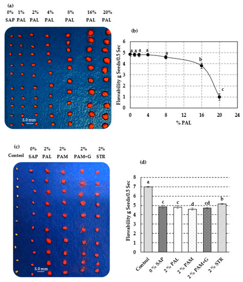Effect of increasing PAL% in coating materials on coated seeds’ (a) water absorbency and (b) flowability performance. Comparison of 2% SAP-coated seeds’ (c) water absorbency and (d) flowability performance with the coated seeds without SAP and the non-treated control red clover seeds. Different letters above error bars indicate significant differences among treatments (p < 0.05).