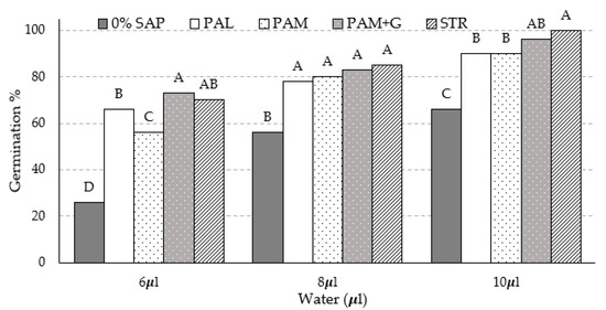 Germination % after 48 h with controlled hydration (6, 8, and 10 µL water added per seed) at 10/20 °C. Different letters indicate significant differences for each available water level (p < 0.05).