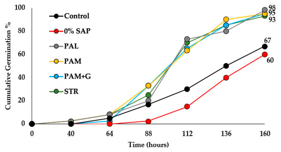 To simulate drought stress during germination, all six treatments were sown under controlled conditions in Montmorillonite clay media. The media was air-dried after sowing, and the containers were sealed after 40 h (MC 45%). One week after broadcasting in Montmorillonite clay media, total germination was 67% for the non-treated controls and 60% for the 0% SAP group. To compare, germination was 93–98% for the red clover seeds coated with all 2% SAP treatments (Figure 7). The Timson’s indices [26] for germination velocity in the non-treated control, 0% SAP, PAL, PAM, PAM+G, and STR groups were 169, 118, 282, 288, 283, and 284, respectively (where greater values have higher and faster germination rates). Collectively, all 2% SAP formulations had similar Timson’s index values, ranging from 282 to 288, compared to the non-SAP checks.