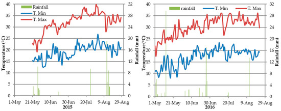 The study area has a Mediterranean climate with an average annual rainfall of 580 mm, mainly distributed from September to March, outside the growing season. During the crop cycle, the total reference evapotranspiration (ETo) was 524.4 mm in 2015, and 506.9 mm in 2016.