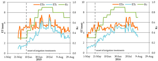 The irrigation treatments were applied three times a week from 8 June to 28 August 2015, and from 18 May to 12 August 2006, though the irrigation regimes were calculated on a weekly basis. The weekly ETc was calculated from the equation: Crop evapotranspiration (ETc) = reference evapotranspiration (ETo) × crop coefficient (Kc) [39]. The ETo was assessed by the Penman–Monteith method [40] using daily data from a meteorological station located 100 m from the experimental field. The Cropwat 8.0 software [41] developed by FAO’s Land and Water Development division was used for ETo calculation. The crop coefficients (Kc) used during the crop seasons were chosen according to the indications provided by Cabello et al. [42].