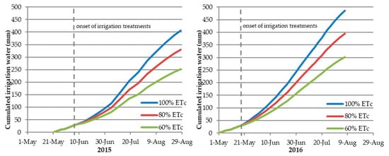 The temperatures and precipitations recorded during the trial periods are reported in Figure 1. The reference evapotranspiration (ETo), crop coefficients (Kc), and crop evapotranspiration (ETc) during the cultivation periods of 2015 and 2016 are reported in Figure 2, whereas the cumulated irrigation water amounts applied during 2015 and 2016 are presented in Figure 3. The scheduled irrigation treatments started at 19 dat in 2015 and 18 dat in 2016, and ended at 100 dat and 99 dat in 2015 and 2016, respectively. The ETo during the irrigation treatment period was 440.0 mm and 434.0 mm in 2015 and 2016, respectively. The ETc values ranged from 334.8 mm in 2015 to 330.3 mm in 2016. The total volume of irrigation water applied, considering also initial watering, ranged from 406.6 mm and 485.1 mm for 100% ETc to 252.0 mm and 302.3 mm for 60% ETc in 2015 and 2016, respectively.