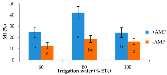 Effect of irrigation treatments and plant inoculation with arbuscular mycorrhizal fungi (AMF) on the mycorrhizal index (MI) of melon plants during two years of experiments (bars with different letters are significantly different at p < 0.05 according to the LSD test).