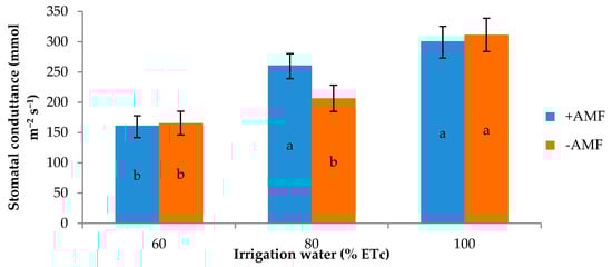 Effect of irrigation treatments and plant inoculation with arbuscular mycorrhizal fungi (AMF) on the stomatal conductance of melon leaves during two years of experiments (bars with different letters are significantly different at p < 0.05 according to the LSD test).