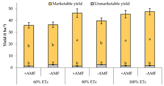 This effect was modified by considering yield per hectare, as plant mortality (5%) was recorded in non-mycorrhized plants irrigated with 60% ETc. Total yield was mainly affected by the irrigation treatments (Table 3), but a different response to deficit irrigation was found between inoculated and uninoculated plants in terms of marketable yield. This difference was due to the effect of the experimental treatments on unmarketable fruit production. The incidence of unmarketable fruits was lowest under no water stress conditions (100% ETc) in both plant treatments (3.7%, on average). Reducing the irrigation volume (80 and 60% ETc) the percentage of unmarketable yield increased up to 6.9%, on average, in the uninoculated plants, whereas it was 3.4% in the inoculated plants (Table 3). Thus, the marketable yield was highest in both plant treatments with 100% ETc (44.7 t ha−1, on average), and was not significantly reduced when reducing irrigation to 80% ETc in the mycorrhized plants (44.9 t ha−1), but dropped by 19% in the uninoculated plants and by 25.3% on average in all the plants irrigated with 60% ETc (34.1 t ha−1, on average) (Table 3, Figure 6).