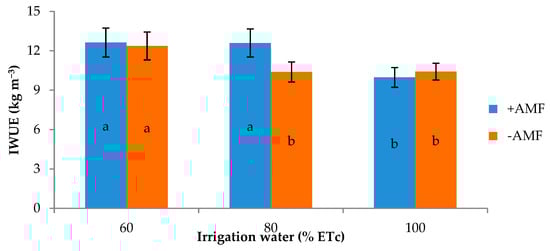 The lowest irrigation water use efficiency (IWUE) (Table 3, Figure 7) was calculated in the treatments with no water stress (100% ETc), reaching 10.2 kg m−3, on average for mycorrhized and non-mycorrhized plants. The moderate water stress (80% ETc) did not affect the IWUE of the uninoculated plants (10.4 kg m−3), but determined a significant increase (+20.9%) in the inoculated plants that recorded the highest IWUE (12.6 kg m−3). A high IWUE was also found with the highest water stress (60% ETc) in both plant treatments (12.5 kg m−3, on average).