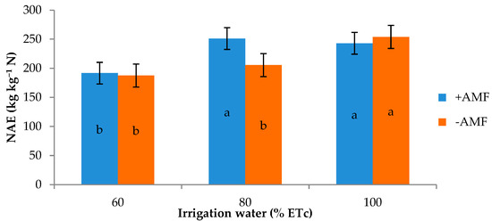 The nitrogen applied efficiency (NAE) was conditioned by the irrigation treatment (Table 3, Figure 8), the highest value (248.4 kg kg−3 N) being in the 100% ETc treatment. Water stress significantly reduced the NAE of non-mycorrhized plants grown under moderate (−17.2%) or intense (−24.5%) stress, and of mycorrhized plants grown under intense stress (−22.8%). The mycorrhized plants reacted better to moderate water stress maintaining an NAE value not significantly different from the well-watered treatments (251.1 kg kg−3 N).
