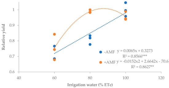 The relationship between the relative yield (yield/maximum yield) of the mycorrhized and non-mycorrhized plants and the volume of irrigation water (% ETc) is shown in Figure 9. The regression analysis found a linear function for the uninoculated plants and a second-degree polynomial function for inoculated plants; these functions were significant (p < 0.001 and p < 0.01 for uninoculated and inoculated plants, respectively), and had a high coefficient of determination (R2), but showed different trends according to plant inoculation.