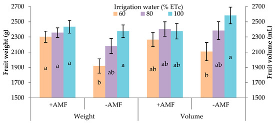 Effect of irrigation treatments and plant inoculation with arbuscular mycorrhizal fungi (AMF) on melon fruit weight and volume during two years of experiments (for each interaction, bars with different letters are significantly different at p < 0.05 according to the LSD test).