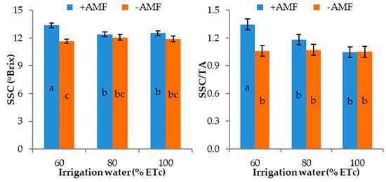 Effect of irrigation treatments and plant inoculation with arbuscular mycorrhizal fungi (AMF) on soluble solid content (SSC) and soluble solid content: titratable acidity ratio (SSC/TA) of melon fruit during two years of experiments (for each parameter, bars with different letters are significantly different at p < 0.05 according to the LSD test).