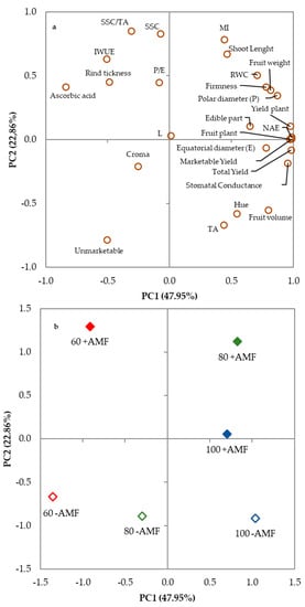Plot of (a) loadings (morphophysiological parameters, yield components, and fruit characteristics of melon, and (b) scores (trials) formed by the two principal components from the Principal Component Analysis (PCA). 60: irrigation with 60% ETc (red color); 80: irrigation with 80% ETc (green color); 100: irrigation with 100% ETc (blue color); +AMF: plants inoculated with arbuscular mycorrhizal fungi (full symbol); −AMF: plants not inoculated with arbuscular mycorrhizal fungi (empty symbol).