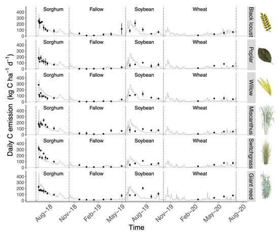 Figure 1. Results of the 2-year (2018–2020) ECOSSE simulation of C emission from soil (measured as CO2) after the reversion of six different perennial energy crops to annual crops. The gray line represents modeled C emission, while the black dots represent measured values. Mean measured C emissions with error bars indicate 95% confidence intervals.