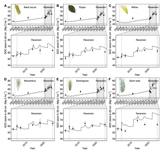 Figure 2. Results of the 13-year (2007–2020) ECOSSE simulation of soil organic carbon (SOC) under six different perennial biomass crops (2007–2018) and their reversion to annual crops (2018–2020) on a former marginal arable land. A focus on the reversion is shown for each crop: (A) Black locust, (B) poplar, (C) willow, (D) miscanthus, (E) switchgrass, and (F) giant reed. Mean SOC from soil cores obtained at different times between 2007 and 2020 are shown with error bars indicating the 95% confidence intervals.