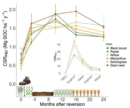 Figure 3. Carbon sequestration rates (CSRPBC, Mg SOC ha−1 y−1) and its variation (CSRREV, Mg SOC ha−1 y−1) before and after the reversion of perennial biomass crops.
